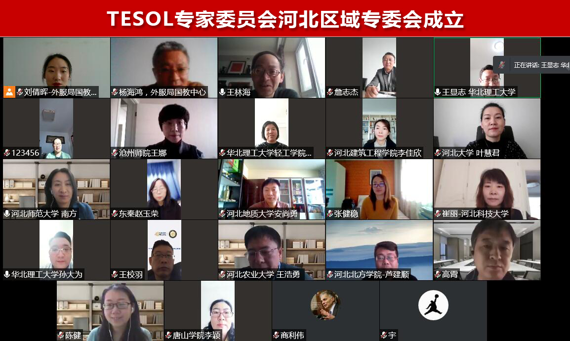 2021年1月21日,TESOL专家委员会河北区专委会成立,同日,TESOL河北区专家研讨会召开。 因疫情原因,TESOL专家委员会河北区专委会成立大会以及专家 研讨会采取了线上视频会议的形式召开。