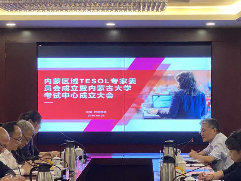 2020年9月26日下午,内蒙区域TESOL专家委员会成立暨内蒙古大学考试中心成立大会在内蒙古大学顺利召开。 国教中心副主任杨海鸿、主任助理刘倩晖出席了会议;内蒙古高等教育学会大学外语教学研究分会会长马占祥、内蒙古大学国际合作与交流处段满福教授、内蒙古大学外国语学院李满亮教授、内蒙古工业大学、内蒙古师范大学等内蒙区域高校20余人参加了会议。